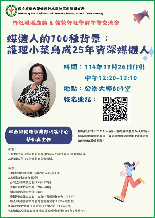 【行社職涯講座】11.20 媒體人的100種背景:護理小菜鳥成25年資深媒體人